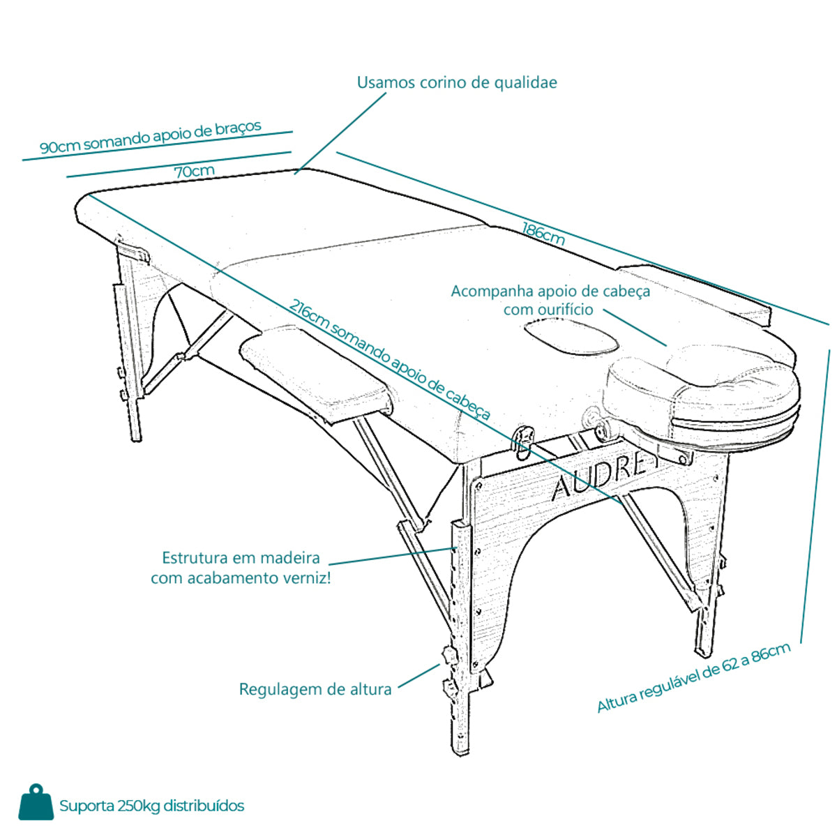Maca com orifício facial e apoio de cabeça ajustável com apoio de braços frontal.