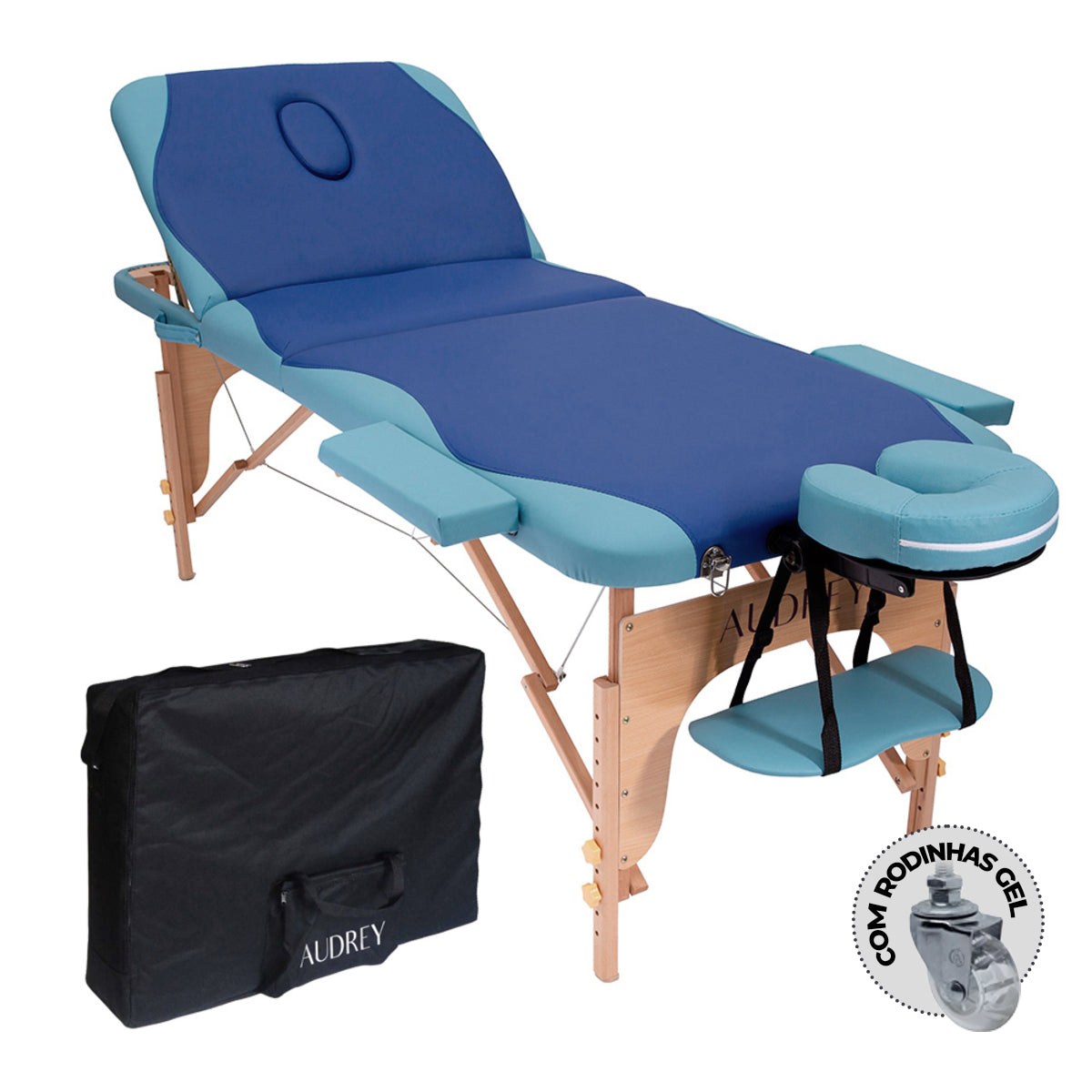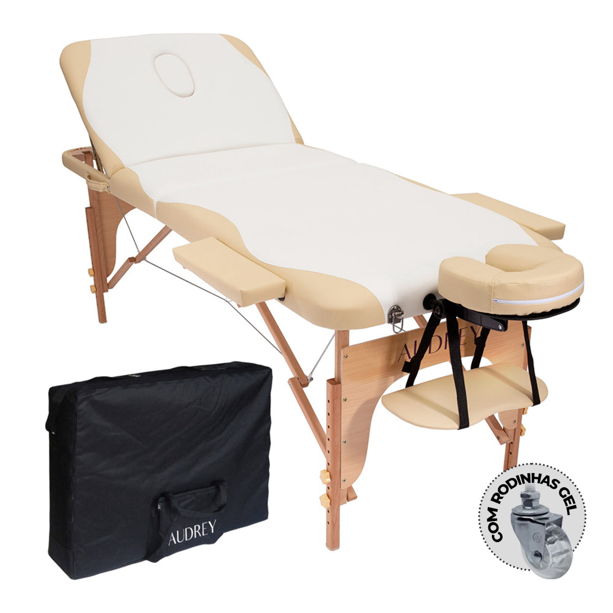 Maca com orifício facial e apoio de cabeça ajustável com apoio de braços frontal.