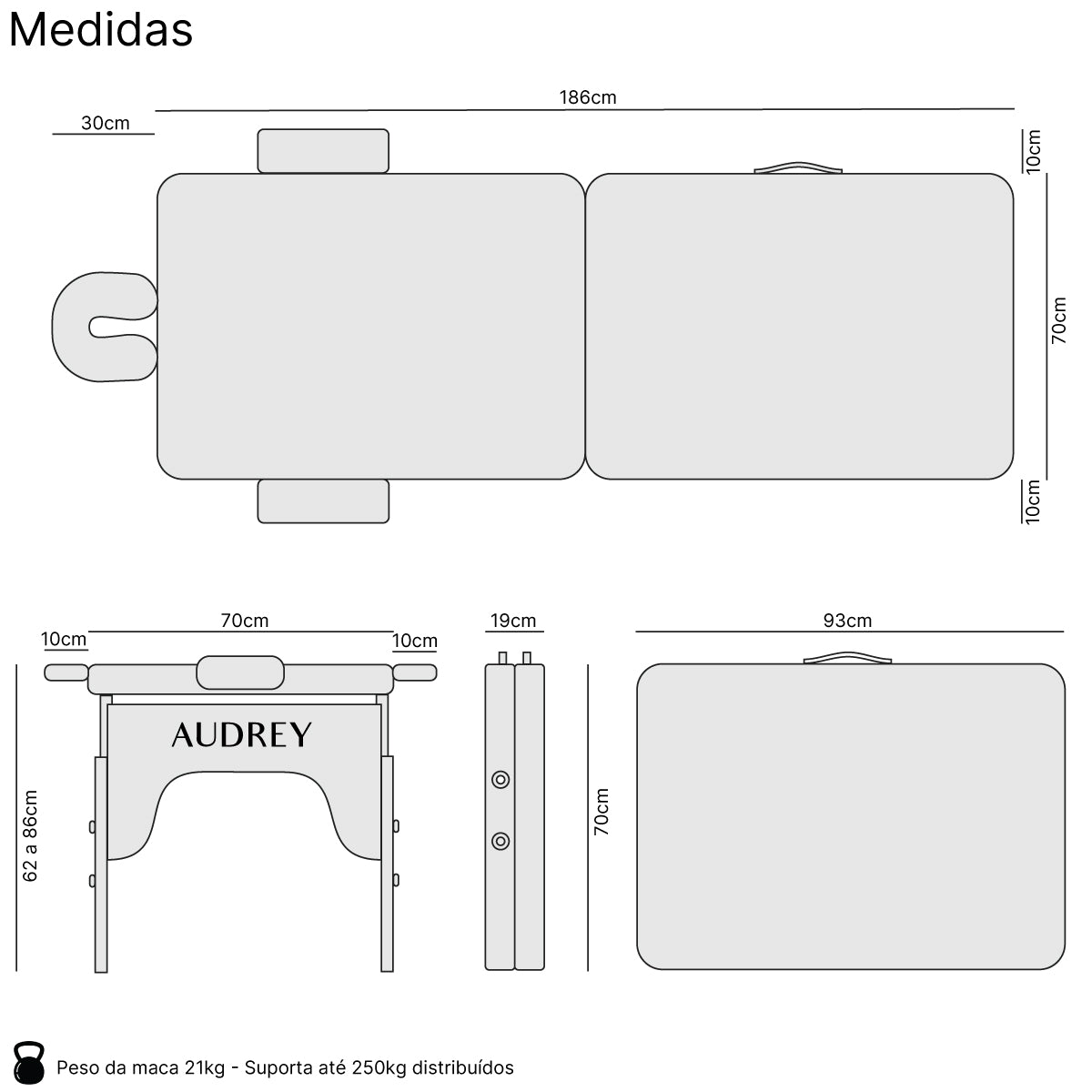 Fácil regulagem por manoplas, a maca pode ficar entre 62cm a 86cm de altura.