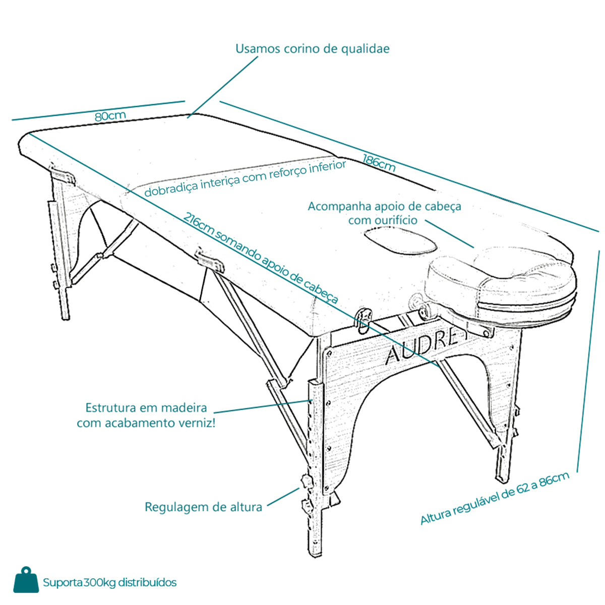 Maca com orifício facial e apoio de cabeça ajustável com apoio de braços frontal.