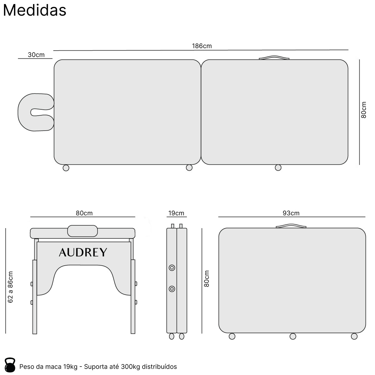 Fácil regulagem por manoplas, a maca pode ficar entre 62cm a 86cm de altura.