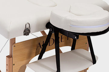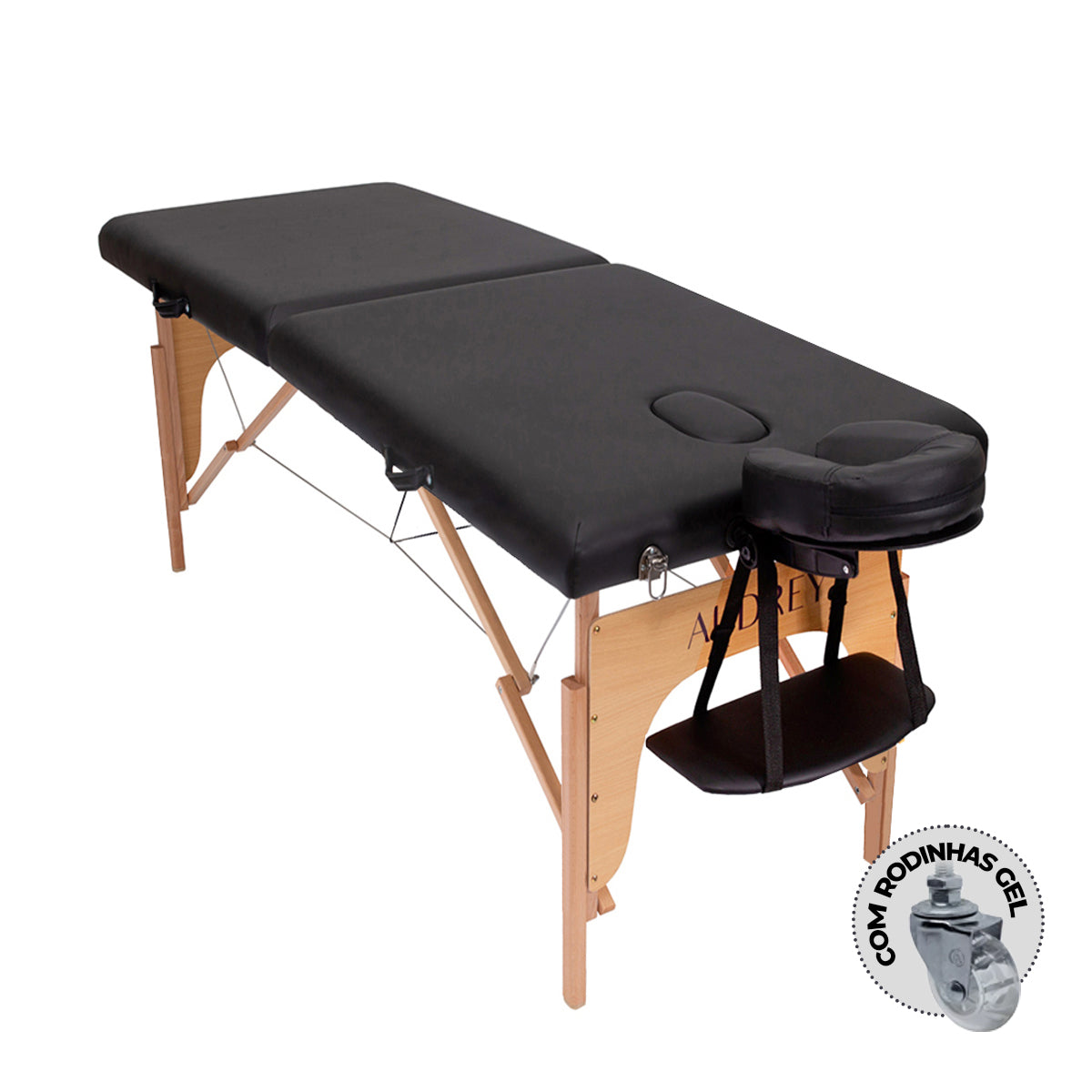 Maca com orifício facial e apoio de cabeça ajustável com apoio de braços frontal.